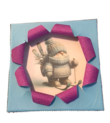 Blow out picture of a gnome skiing, 8X8 inches